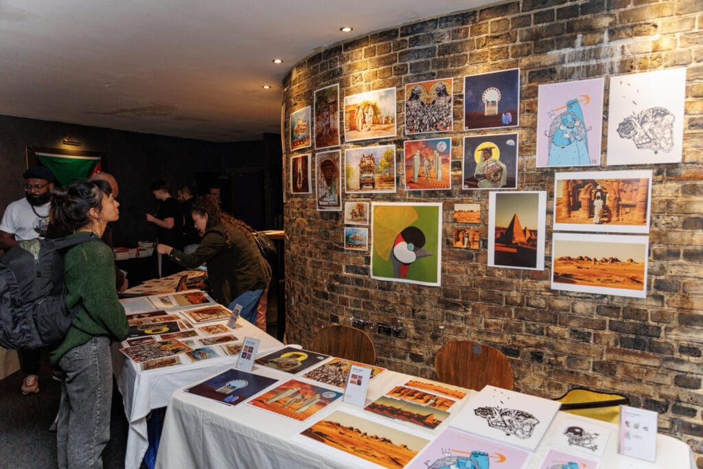 Several Sudanese artists displayed prints and lithographs at the event, with proceeds also helping to support displaced artists stranded in Ethiopia and Egypt. Hussein Merghani’s watercolours, of typical scenes from Sudanese towns and villages, were very popular. Yasmin Elsadig’s (KICS Class of 2010) graphic prints, which reimagine symbols of Sudanese heritage and iconography, were also in high demand. Alaa Satir, whose feminist street art featuring Sudanese ‘kandakas’ was an iconic feature of the 2019 revolution, was also featured.